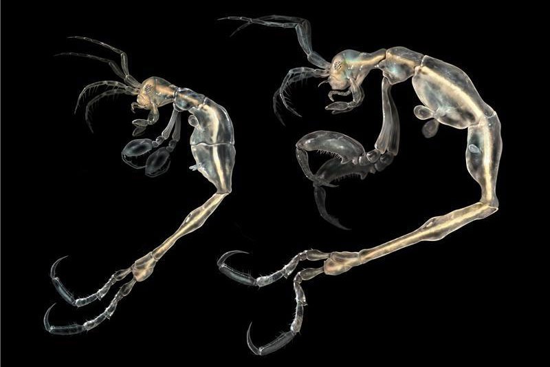 Skeleton Shrimp: A See-through Crustacean Liropus minusculus Location: California, U.S.A. This tiny shrimp, the smallest in the genus, was identified from among specimens originally collected from a cave on that island of romance, sunny Santa Catalina, off the coast of Southern California. Part of a marine family known as skeleton shrimp, only distantly related to the ones some humans love to dip in cocktail sauce, this crustacean is the first of its genus to be reported in the northeastern Pacific. The new species has an eerie, translucent appearance that makes it resemble a bony structure. The male's body measures just 3.3 millimeters (about an eighth of an inch); the female is even smaller at 2.1 (less than a tenth of an inch).