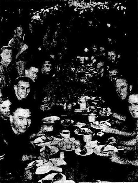 They were then flying our wounded home from New Guinea and Bougainville. Now they are here to fly our prisoners of war down to Bangkok. Almost the first person they met at Changi camp was Captain Ben Barnett, Australian Test cricketer. We left him to run into Flight-Lieutenant "Huck" Finlay, former international Rugby player, and before the war A.B.C. manager in Brisbane