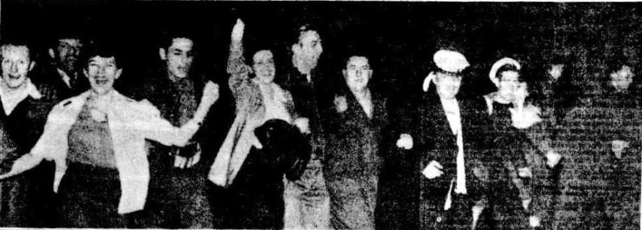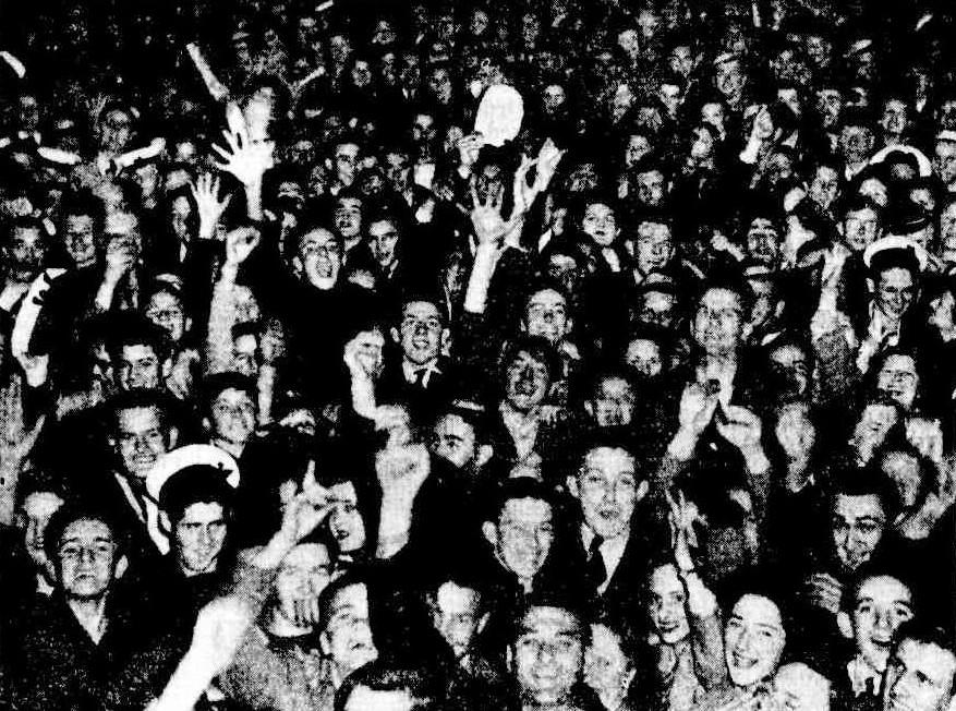 Every town and village in Britain, America,, and the Dominions celebrated victory with joyous abandon. Londoners, tired out after several late nights of anticipation, had gone to bed when the Prime Minister, Mr. Attlee, announced Japan's surrender at midnight, but crowds quickly assembled. They are still celebrating. The heart of New York-Times Square and Broadway-was packed with two million laughing, cheering, noisy people within an hour of the announcement. The celebrations look like lasting several days. CHEERING BRITISH, AMERICANS GREET PEACE VICTORY BONFIRES IN ENGLAND. (1945, August 16). The Sydney Morning Herald (NSW : 1842 - 1954), p. 4. Retrieved from http://nla.gov.au/nla.news-article17950197