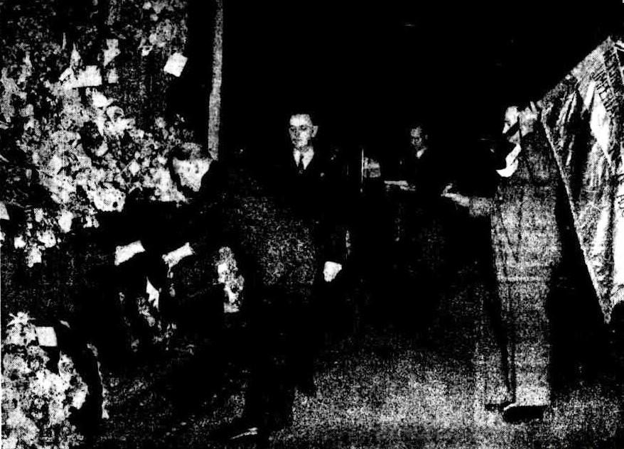 At the sunset service held at the Cenotaph, Martin Plane, yesterday, the State president of the R.S.L.. Mr. J. C. Nearie, is pictured placing a wreath on behalf of the League.: