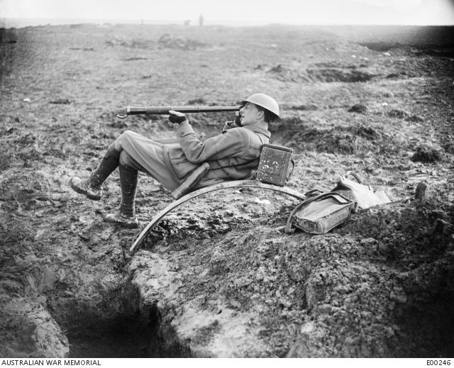 Near Martinpuich, France. Captain C E W Bean, the Australian Official Correspondent, watching the Australian advance through a telescope. Photographer Baldwin, Herbert Frederick, taken on 26 February 1917,
