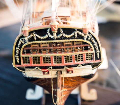 'Montames' model built by Tony Jaksich; this ship was launched May 1794 with 76 Guns and Cannonaides on her Quater Deck. On March 6th, 1810 she sank in a violent storm in the Bay of Cadiz. This Model's length is 1.250m and Height is .930m.