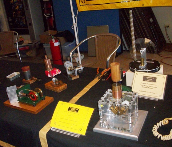 Hot Air Engines: These three engines are hot air engines. The one at the back is a low temperature differential hot air engine and it was made by one of our members, Alf Lang, who has since passed on. It relies on a temperature difference of about 3 to 5 degrees Celsius to work. The ivory box contains lamps that create heat and that heat is transferred to an air column inside the two discs. The top disc is a cold disc; so you have a hot area and a cold area; essentially using that difference we create a positive and negative pressure in that brass cylinder and that extracts energy from the changes in air temperature and pressure to drive the system.