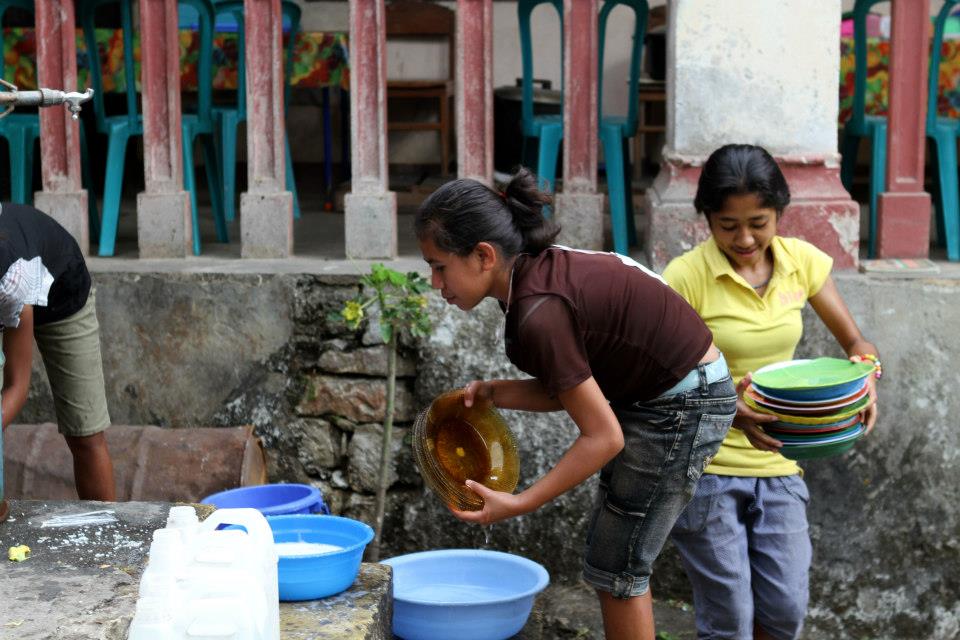 In Soibada there are no significant dams and only two perennial rivers. The rivers are steep and none are suitable for transport. Construction of small earth bank dams assists water storage, but for the most part people rely on underground water from wells for drinking. Any water available for irrigating crops is reserved for rice fields. Some of the photos here show how the women at a local orphanage wash the dishes and prepare meals. The children have to walk for around half an hour each way to fill buckets from a stream to do the cooking and washing.
