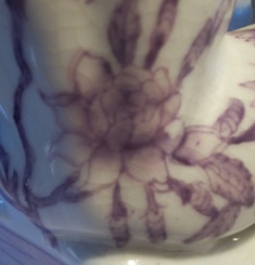 This week we examine a curious piece acquired simply because of its symbolism and positive emphasis. The mark on its base is, as far as we can tell, a modern one. It occurs in red, blue or black. Ours, in lavender, is not recorded anywhere although research shows that the colour purple, in Chinese culture, equates with spiritual awareness, physical and mental healing, hence strength, abundance; red purple brings luck and fame.