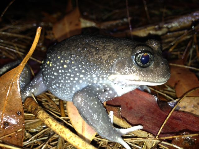 Part of Pittwater Environmental Foundation’s Mullet Creek Large Project grant work involves fauna surveys of the catchment. In February (2013) a rare Giant Burrowing Frog was located near the creek's northern arm. "Giant" for a frog means the body is about 10cm long. This survey was undertaken by Tracy Chambers and Chris Jolly, took this photo.
